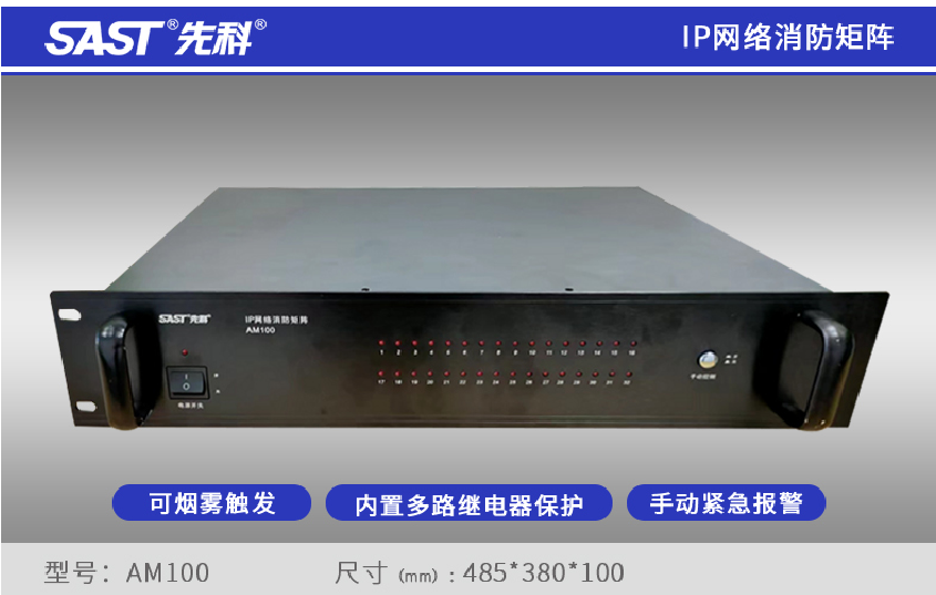 IP32网络消防矩阵 1.内置多路继电器保护 2.可烟雾触发 3.手动紧急报警 4.机器尺寸:长485*宽380*高100mm 5.包装尺寸:515x460x180mm
