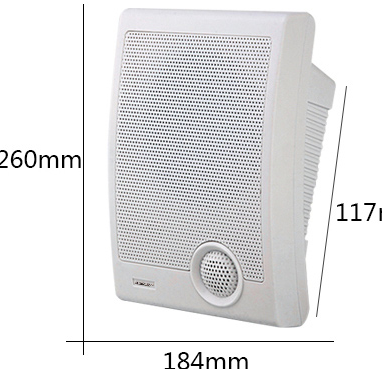 1.喇叭尺寸:6.5寸,功率:25W 2.电 源:DC12V/6.5mm插头 3.频率响应:110-12KHz 4.灵敏度:98dB±2dB 5.壁挂尺寸:185×120×260mm 6.内箱尺寸:187x120x261mm 7.外箱尺寸:505x406x540mm